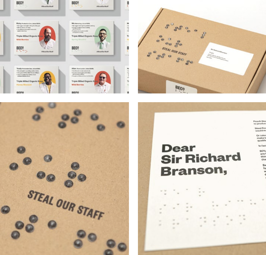 To connect with hiring decision-makers directly, Beco turned to direct mail services. The brand designed customized soap boxes that featured the actual CVs of standout employees—and then used a professional print and mail service to package and send them directly to the desks of CEOs across the U.K.